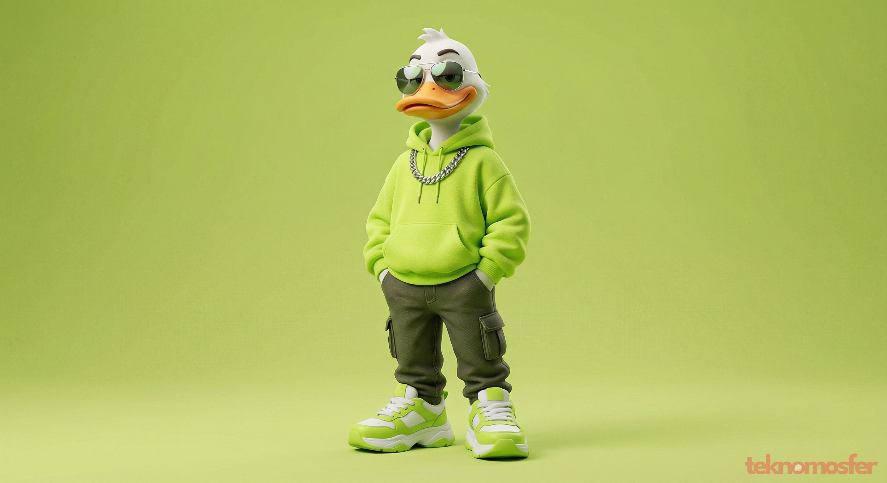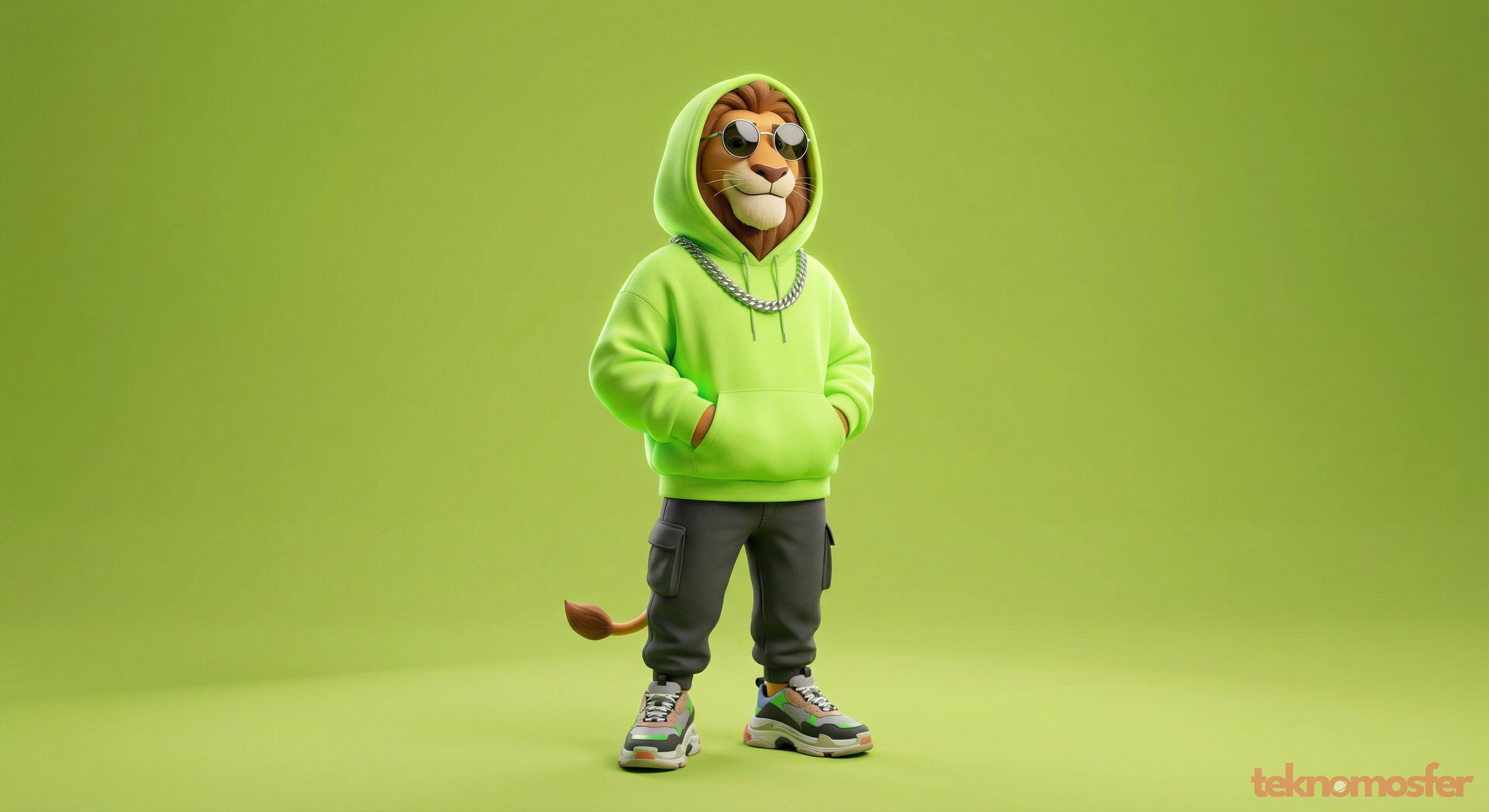 Alıntı:Full-body 3D stylized anthropomorphic cartoon [HAYVAN_ADI] character wearing modern streetwear, oversized neon green hoodie, cargo pants, chunky sneakers, reflective sunglasses, silver chain necklace. Confident relaxed pose with hands in pockets. Minimal studio background in solid lime green. Soft studio lighting, smooth shadows, high detail fabric texture, Pixar-quality 3D render, ultra-clean composition, centered framing, fashion editorial character design, 8K resolution.